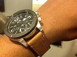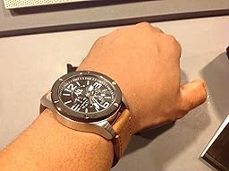 - Round watch with luminous hands and indices featuring 60-second, 60-minute, and 24-hour chronograph subdials^48 mm stainless steel case with mineral dial window^Quartz movement with analog display^Leather band with buckle closure^Water resistant to 100 m (330 ft): In general, suitable for swimming and snorkeling, but not scuba diving